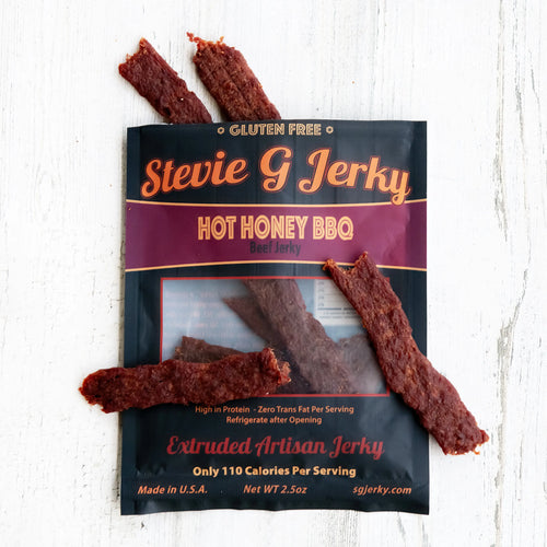 Our hot honey BBQ beef jerky is an irresistible snack that offers a perfect blend of sweet, spicy, and smoky flavors. Made from premium quality beef that is marinated in savory Sweet Baby Ray's BBQ sauce and infused with rich honey and hot sauce flavors, this beef jerky is a mouthwatering treat for any meat lover.